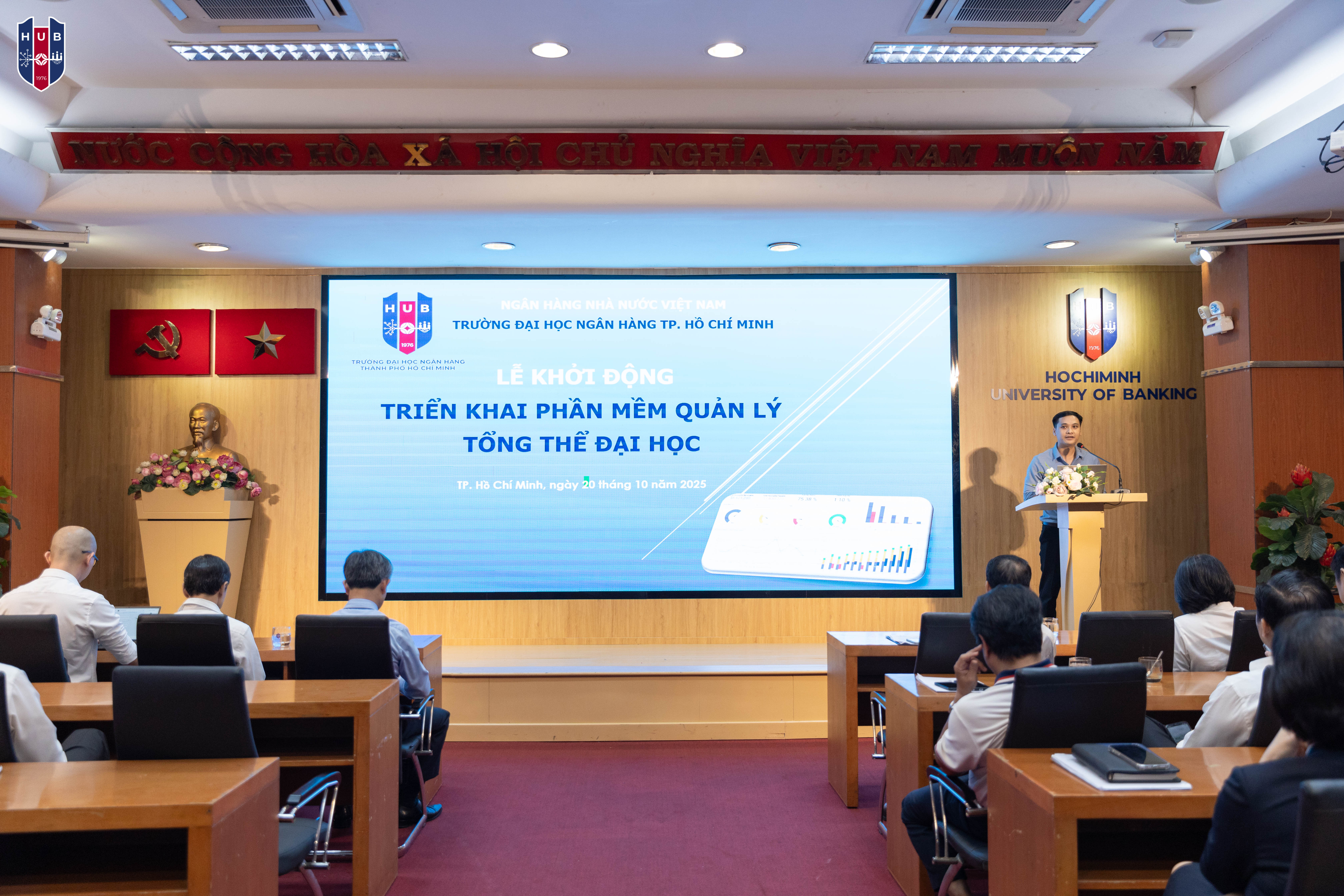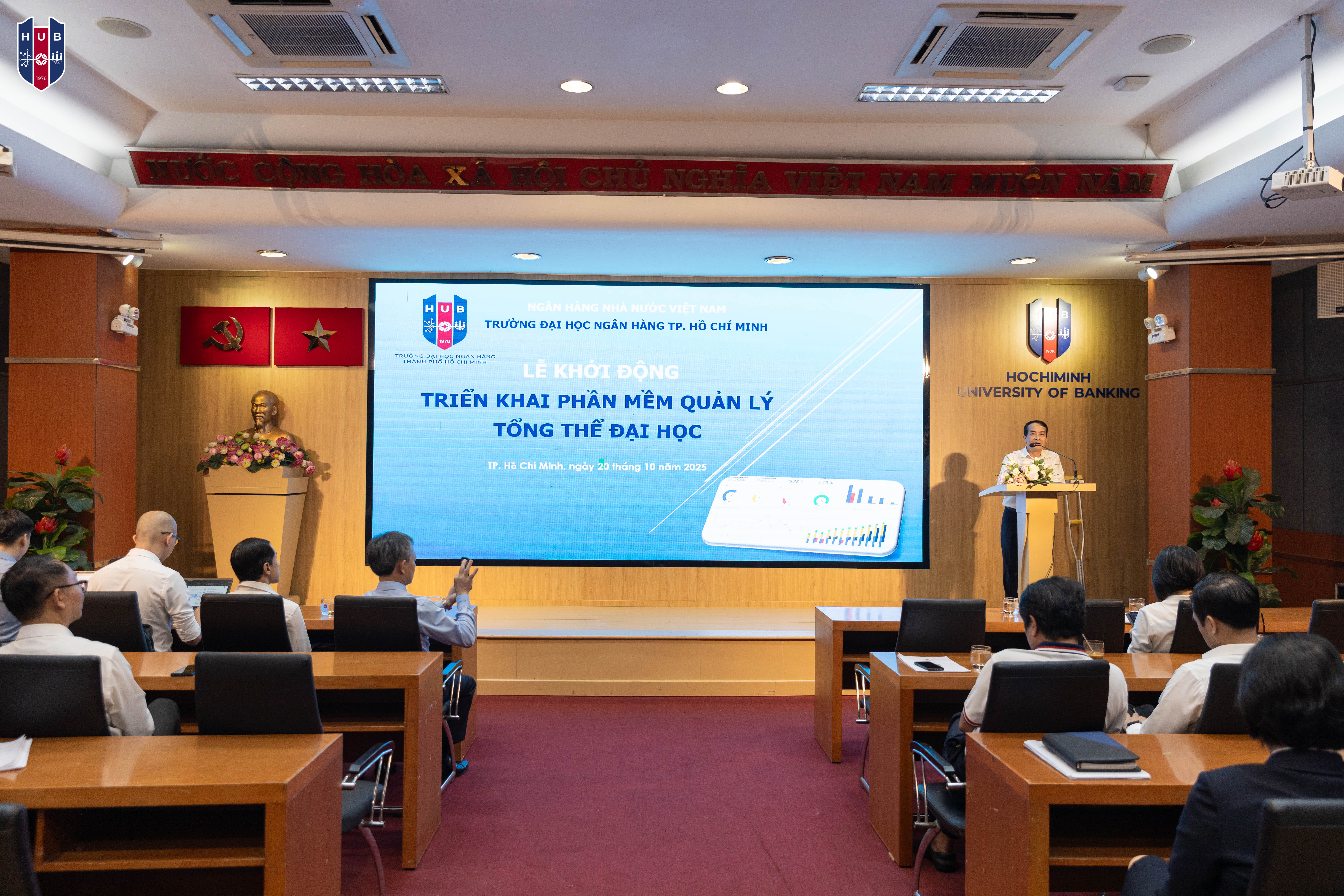 Sáng ngày 20 tháng 10 năm 2025, Trường Đại học Ngân hàng TP. Hồ Chí Minh (HUB) đã long trọng tổ chức Lễ khởi động triển khai Phần mềm Quản lý Tổng thể Đại học, đánh dấu một cột mốc quan trọng trong tiến trình chuyển đổi số toàn diện nhà trường. Đây là dự án trọng điểm nhằm xây dựng hệ sinh thái quản trị đại học thông minh, hiện đại, đồng bộ và hiệu quả, góp phần nâng cao chất lượng điều hành, giảng dạy, nghiên cứu và phục vụ người học.